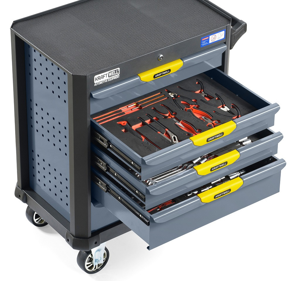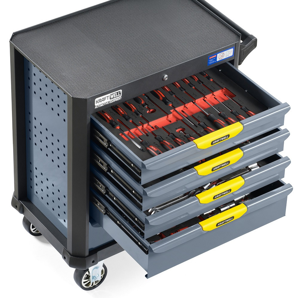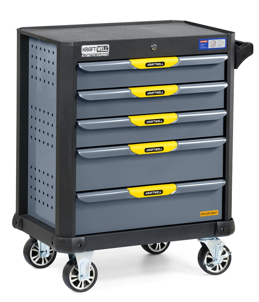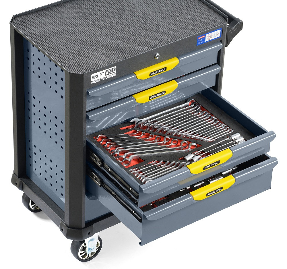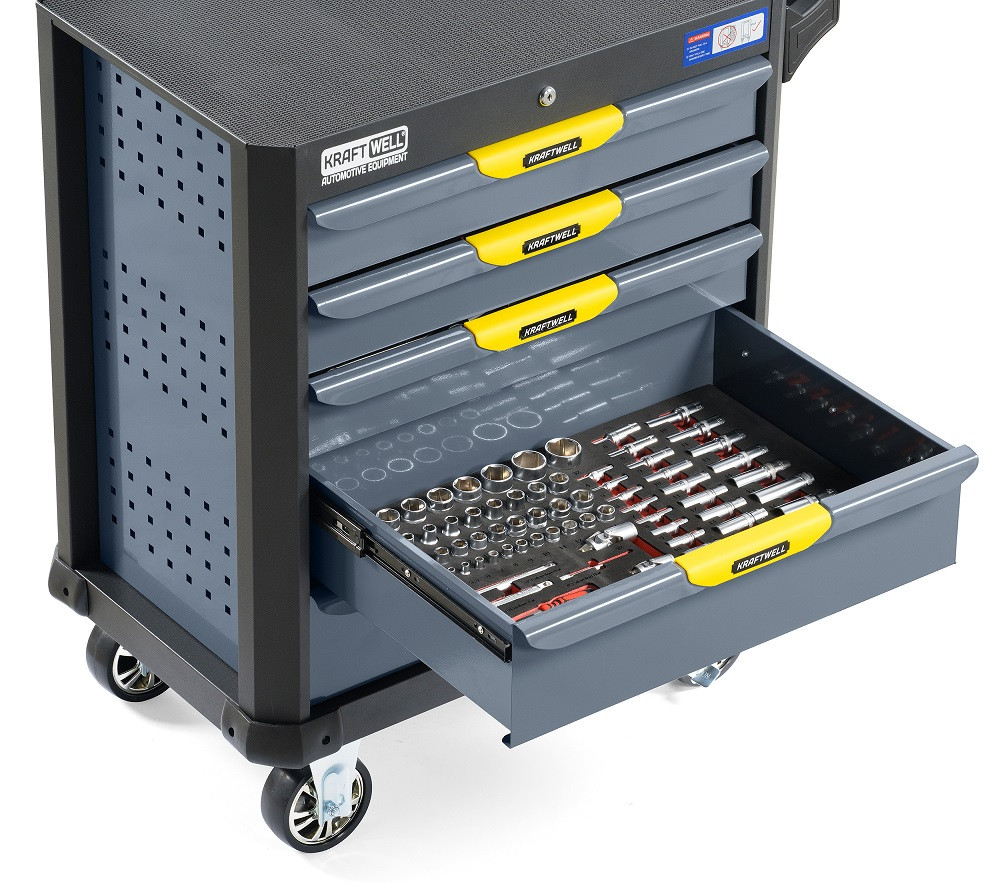 Тележка инструментальная с 5 выдвижными ящиками. Цвет серый. Ящики на телескопических направляющих с фиксацией и доводчиком. В комплекте инструмент 157 предметов на 4 ложементах.
