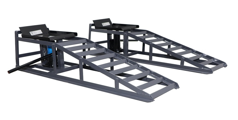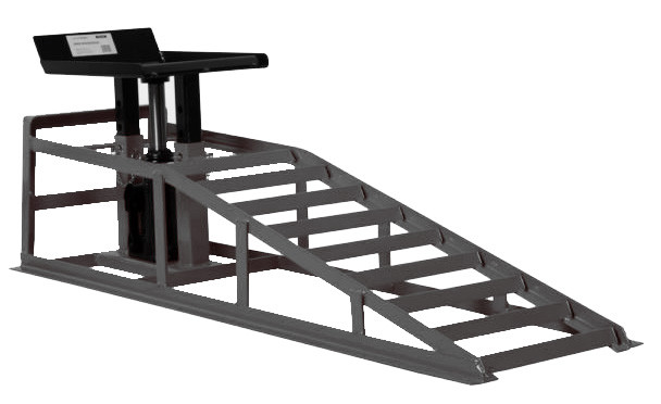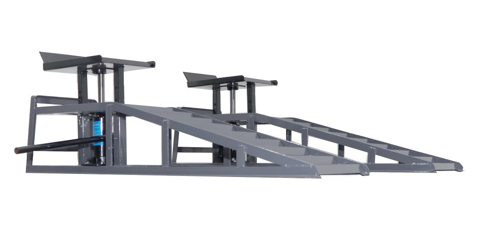 Заездная рампа с гидравлической подъемной площадкой. Ручное управление подъемом и спуском площадки. Грузоподъемность 2000 кг.